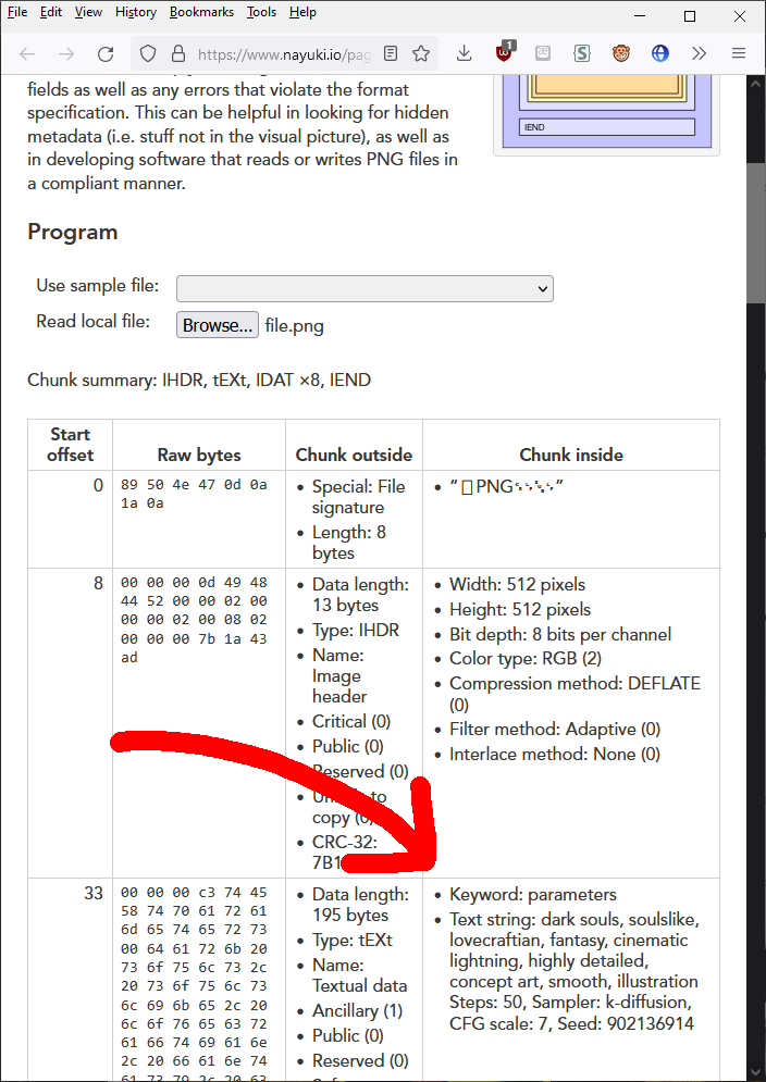 Adds information about generation parameters to PNG as a text chunk. You can view this information later using any software that supports viewing PNG chunk info, for example: https://www.nayuki.io/page/png-file-chunk-inspector